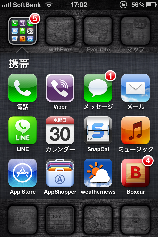 今までは横列のみの仕切りだったけど、アプリ毎に仕切るタイプにした。基本はもちろん白文字が映えるように黒。仕切りも黒。カビみてぇ。でも枠組みがあるおかげでアプリが際立つ。オススメ。