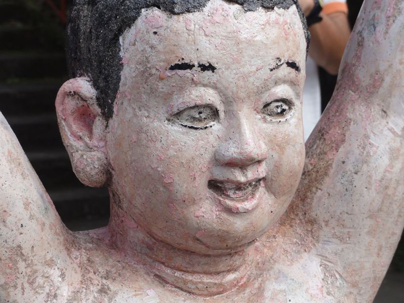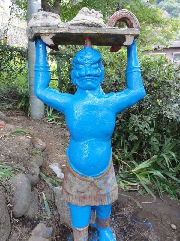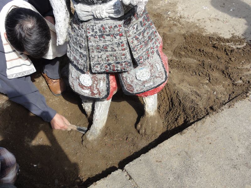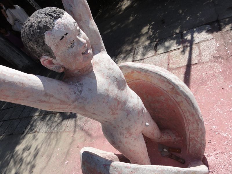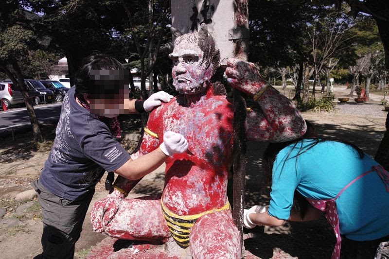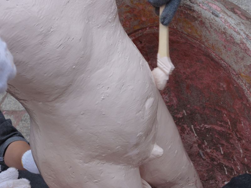 古くなった塗料を剥がします。普通に工具を使って削って落とすのですが、なかなか落ちないところは工具のカドでガンガン叩いてました。最初見たときは像に傷つかないの!?と心配でしたね。
