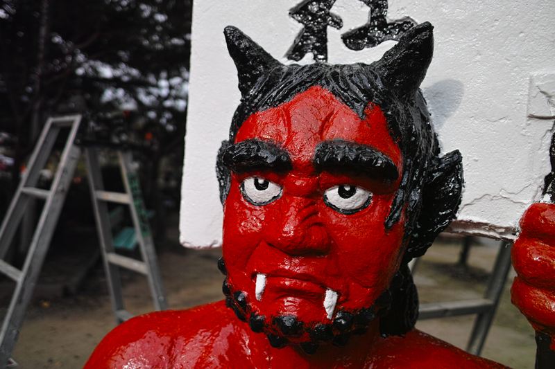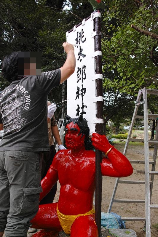 @ism136さんが鬼の持っている幟を塗ります。 @ism136さんのこの像に掛ける思いはなんなんだw