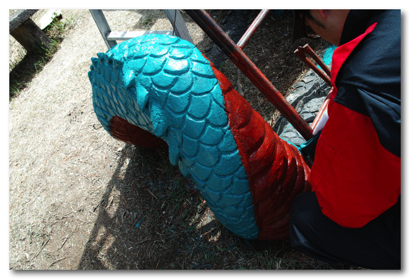 池の真ん中に佇む弁財天も四方八方から塗り塗りされています。足場がすごい!