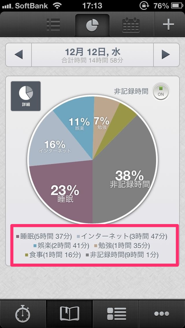 円グラフはその日なにをしてたのかってのを簡単に把握するためには素晴らしいですが、詳細にはわかりません。しかしこちらの表示形式ならとても詳細に知ることができます。