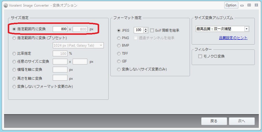 サイズ指定を「指定範囲内に変換」にします。んで、僕は最大で800px以内にしたいので800と入れます。