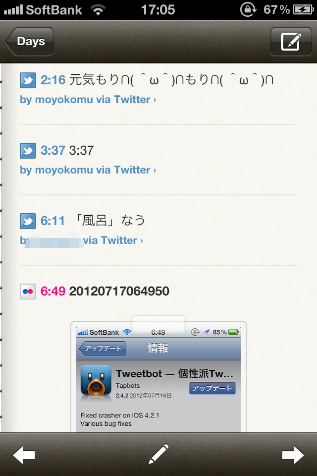 先ほどの画像の6:11にそのつぶやき(「風呂」なう)が載っています。