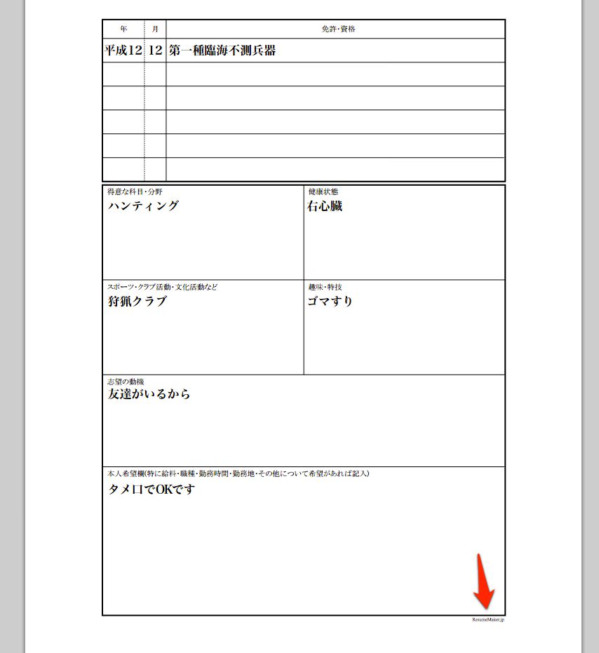 右下に履歴書メーカーで作ったよって刻印が入ります。
