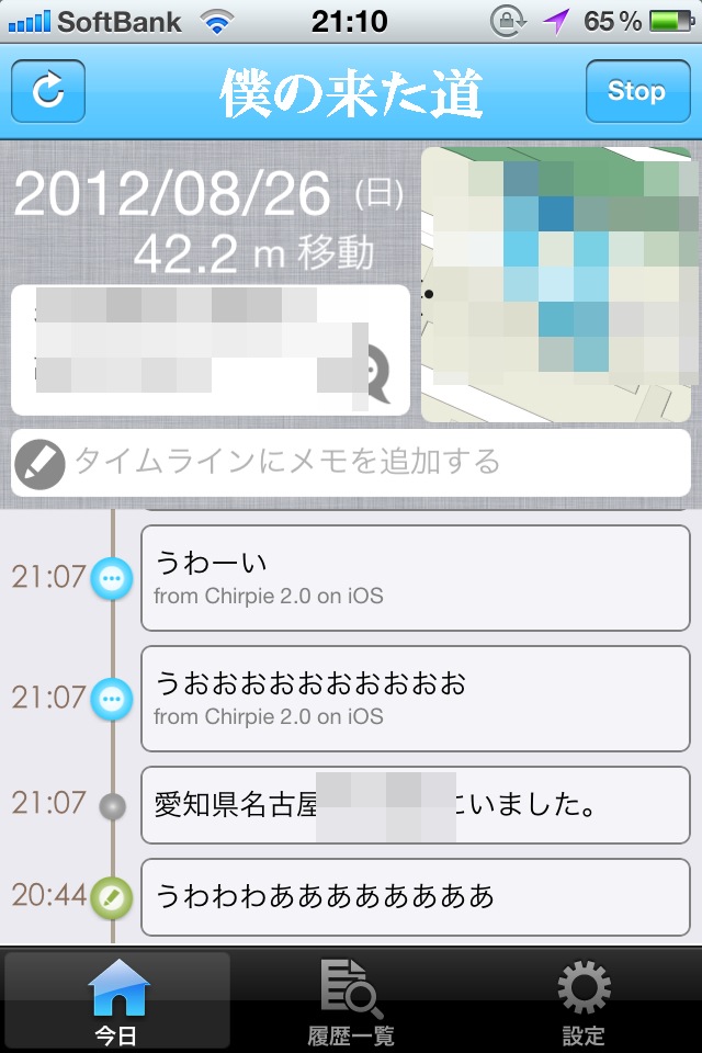 もちろんこのように「僕の来た道」単体でもコメントは残せますが、やっぱりつぶやき専門アプリとの差は歴然。Chirpieのが断然早いです。