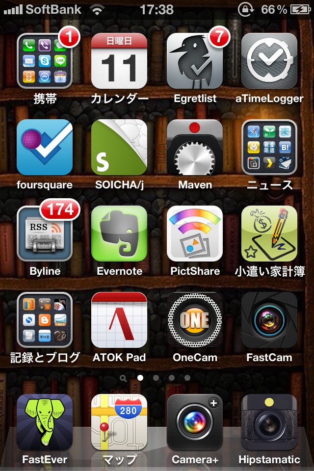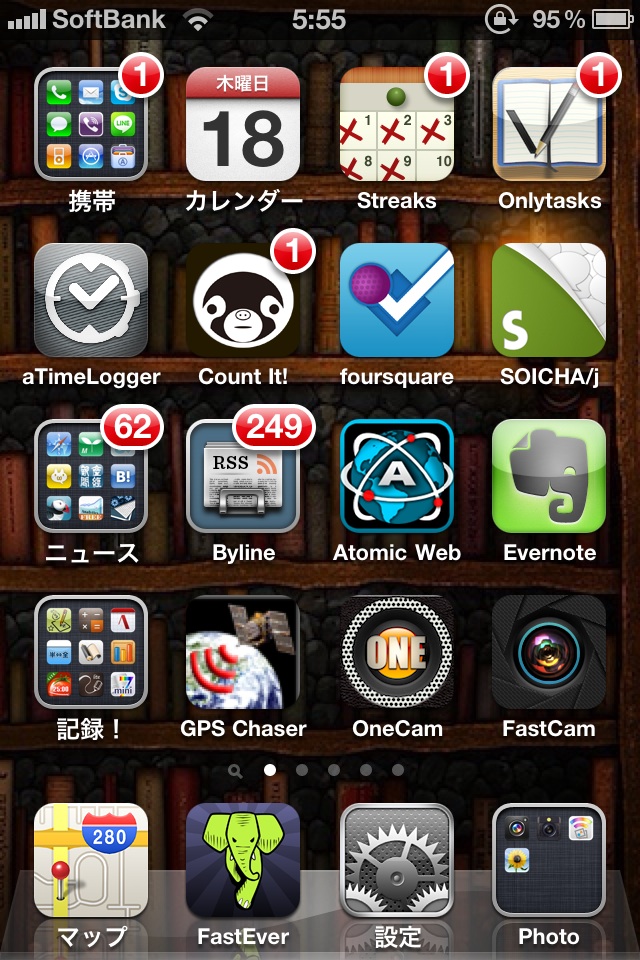 ・マップとFasteverの位置を変更。隅っこにあると間違えて押してしまうので。マップが起動するとめんどくさい。Fasteverなら「間違えて起動してしまいました」って文章を書いてそのままEvernoteに送りつけてあとから見て笑える。…笑えるか?
