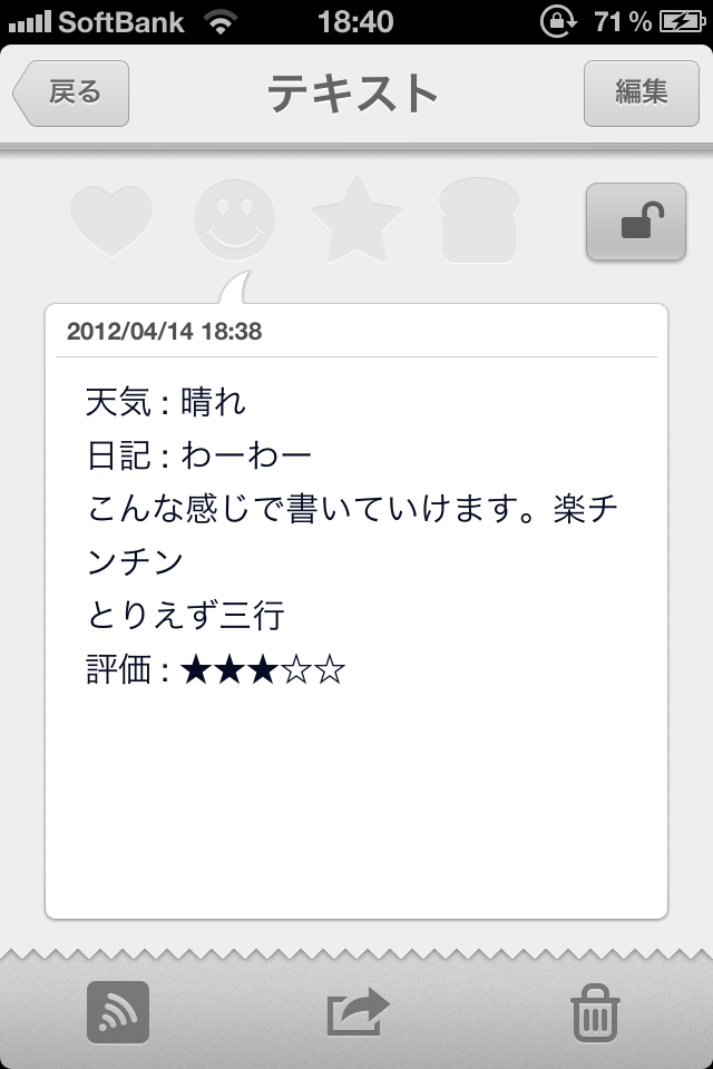 あくまで送信できるのはテキストのみなので、天気はアイコンを選択するのではなく、予め晴れだの曇りだの登録しておいて、後から選ぶ形式にするとすごく楽チンです。