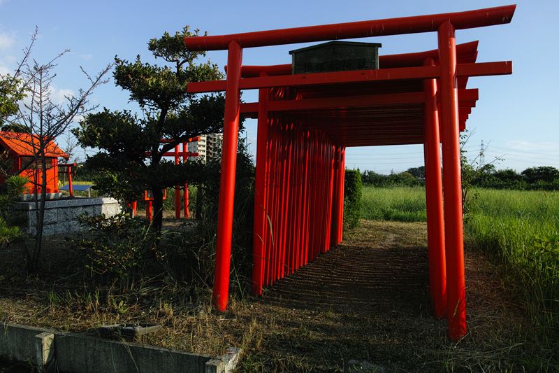 こんな田んぼの中で赤い鳥居が見える。
