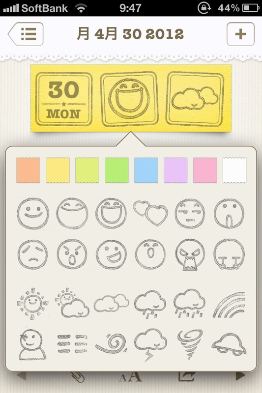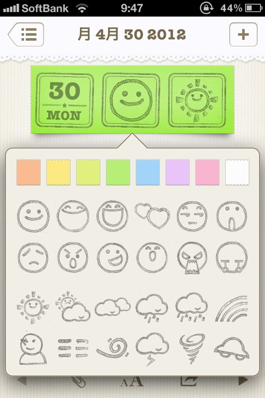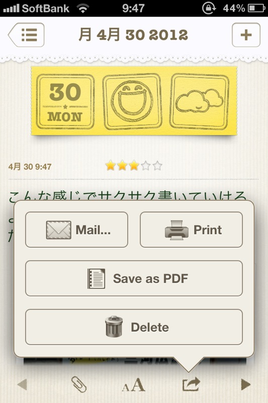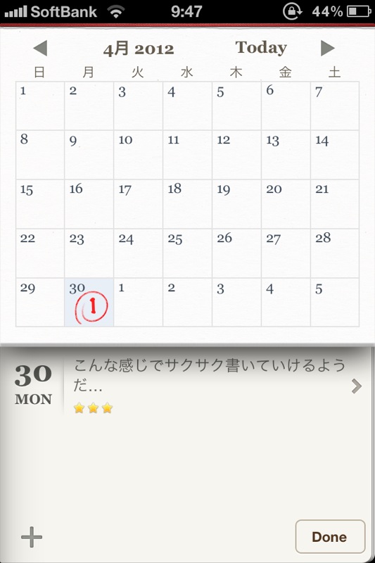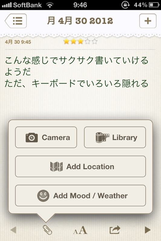 早速最初の画面に戻って日記を書いてみる。中央上段の星は0~5段階で適当に付けられる。