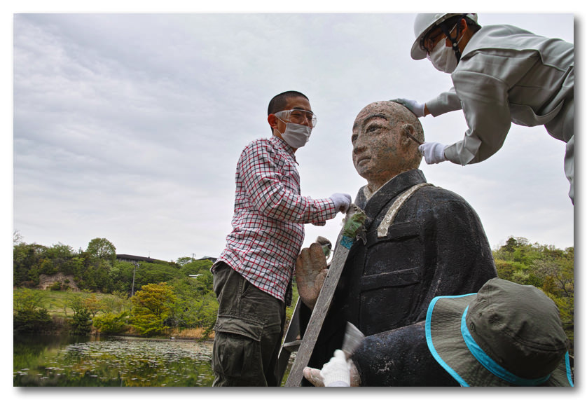 マスク姿だし、パッと見だと像を傷つけるヤンキーに見えますが、ちゃんと修復してるんです。
