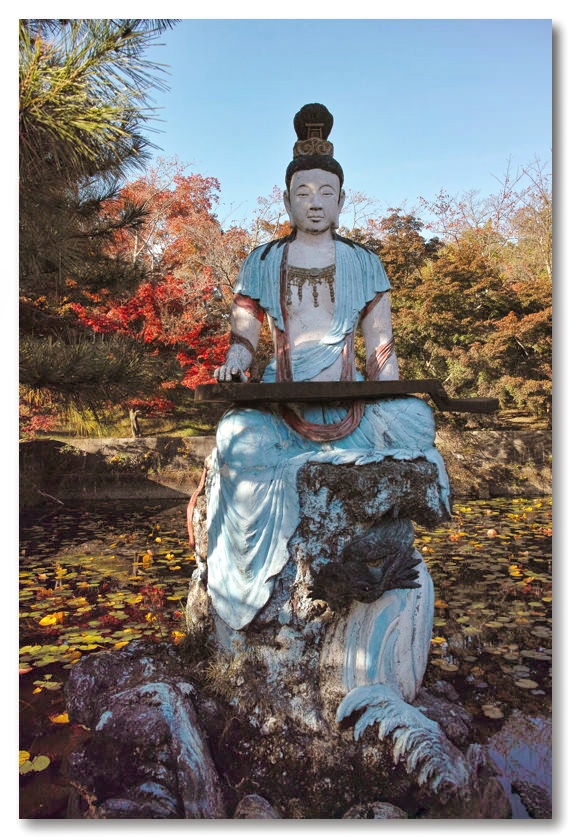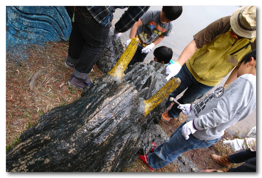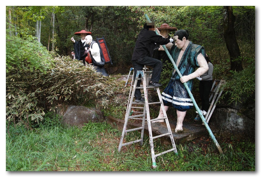 『川越の名号』は藪の中だし、弁財天はこんななので僕は1番安全そうな湖際の像の修復に当たりました。