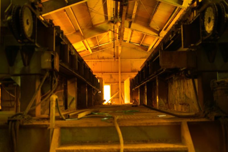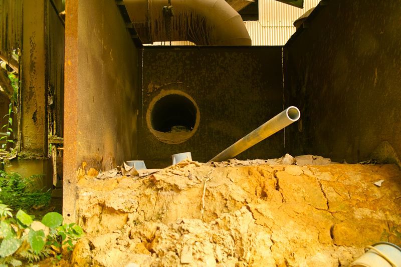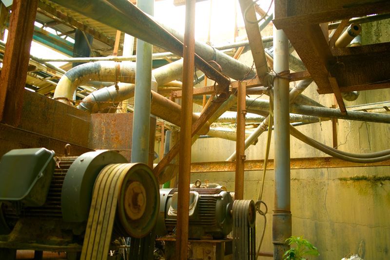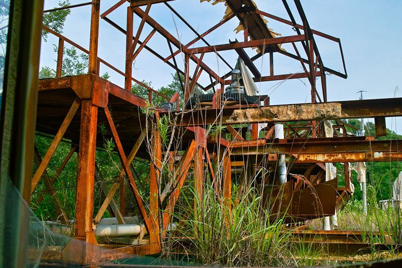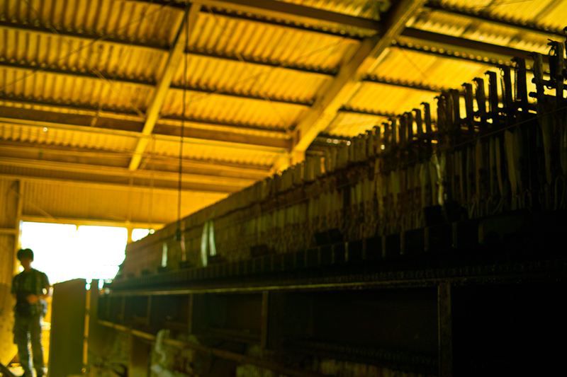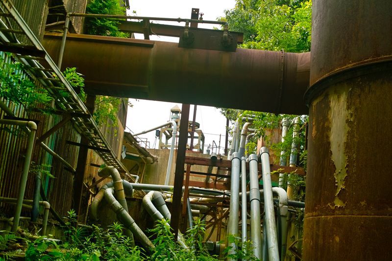 基本的に落ちて死ぬ高さではないんですが、足元がうすーい鉄板一枚でらところどころ穴があいてたりとかなり簡素な設計。ほんとうにここで作業してたんか!?と疑ってしまう。