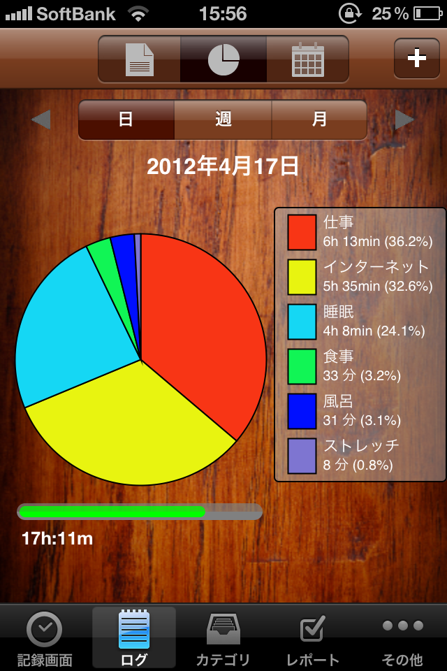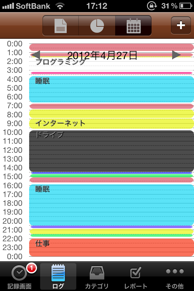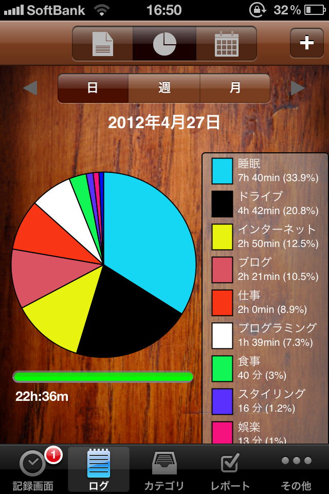 これはaTimeLogger。非常に見やすいし、1日に何をどんだけ時間かけたのかがパッと見てわかる。