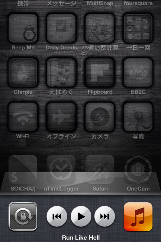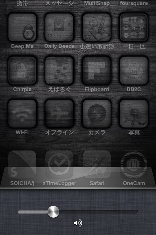 そっからさらに右へスワイプするとiPhone全体のボリュームコントロール(?)がでてきます。そこはよく知らない。