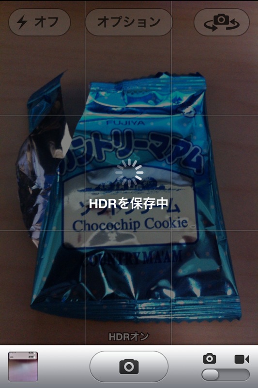 HDRというのはまぁ簡単に説明すると白飛びとか黒く潰れたりするのを防いでくれる機能です。これをオンにすると写真の保存に若干時間がかかってしまいますが、失敗をなくすって意味ではオンにしておいた方がいいと思います。