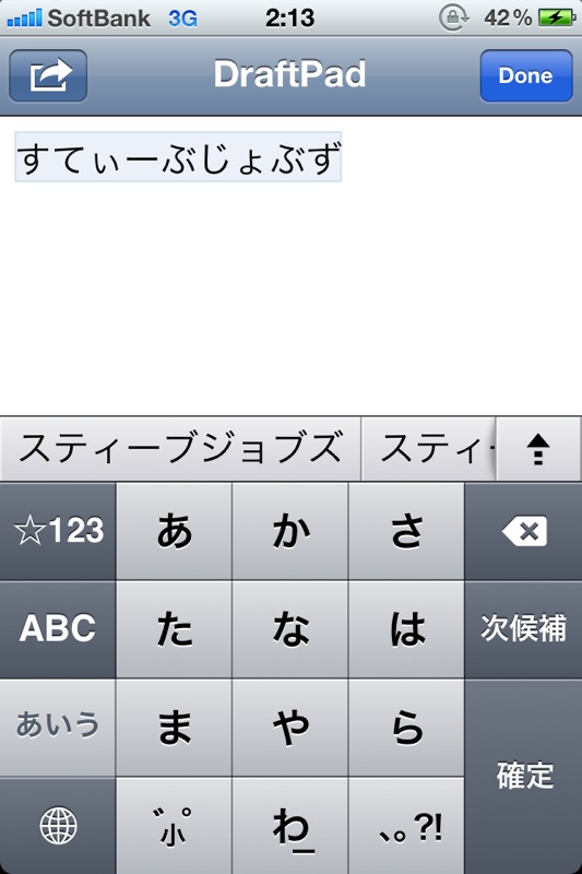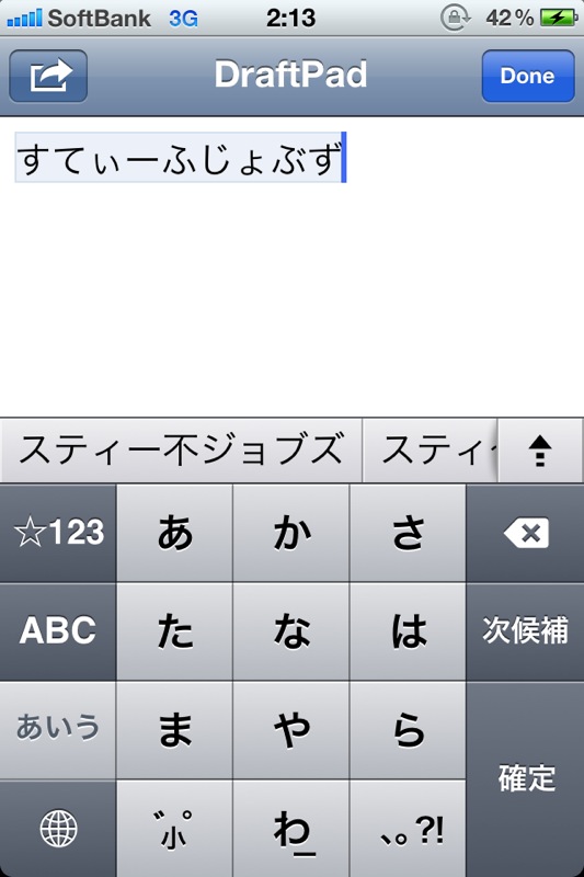 「ふ」の後ろにカーソルを持ってきたら、予測変換のところにある「スティーブ」をタップしてもいいし、一度「ふ」を削除してから「ぶ」と入力しても大丈夫です。