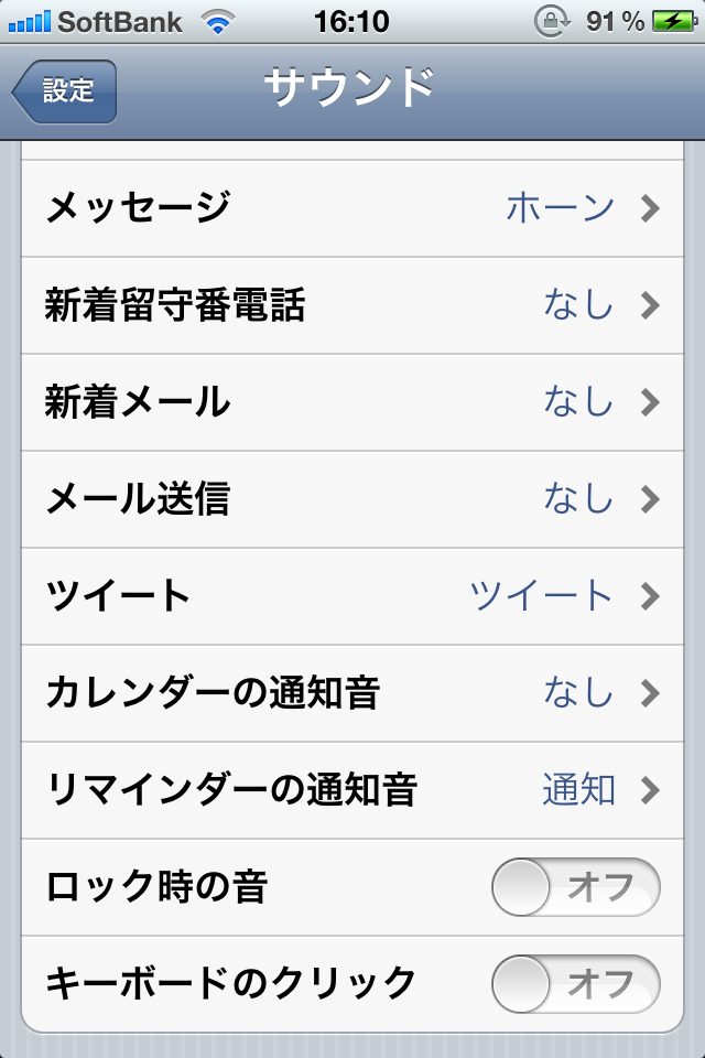 デフォルトでオフになってると思いますが、ロック時の音やキーボードのクリックはオフにしときましょう。まぁ普段からマナーモードにしてるので関係ないですが。