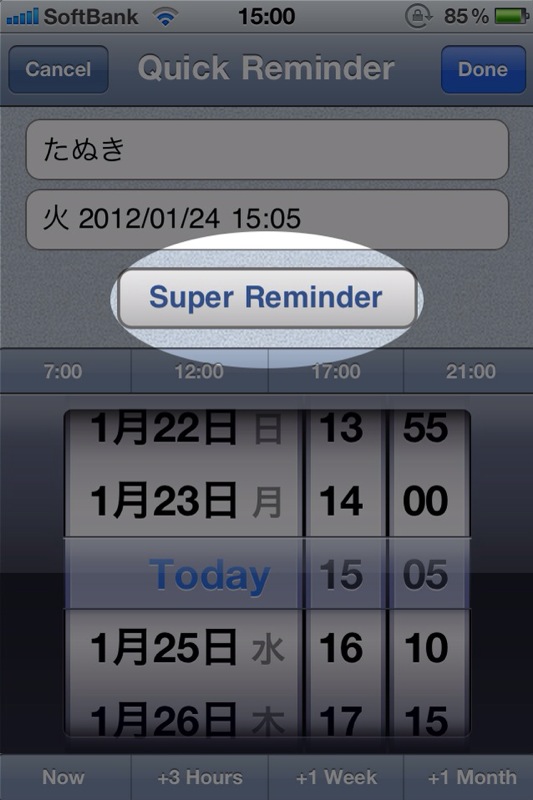 タスクを入力したらリマインダー設定をします。このスーパーリマインダーってのがすごいのよぅ。