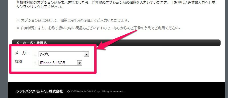メーカーと機種を選択させられるのでアップル、iPhone5(容量は人それぞれ)を選択