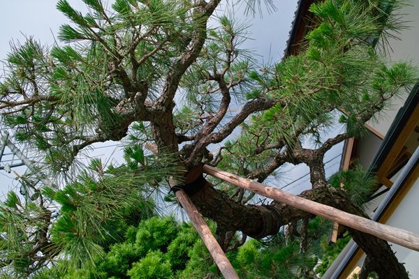 お寺の前の駐車場には柵で囲われた松の木があります。