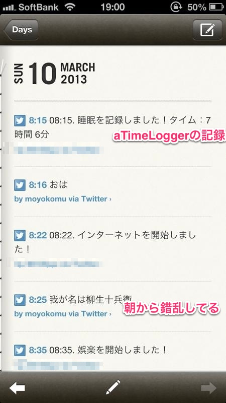 僕はライフログ用のTwitterアカウントを取得してそいつとaTimeLoggerを連携させています。