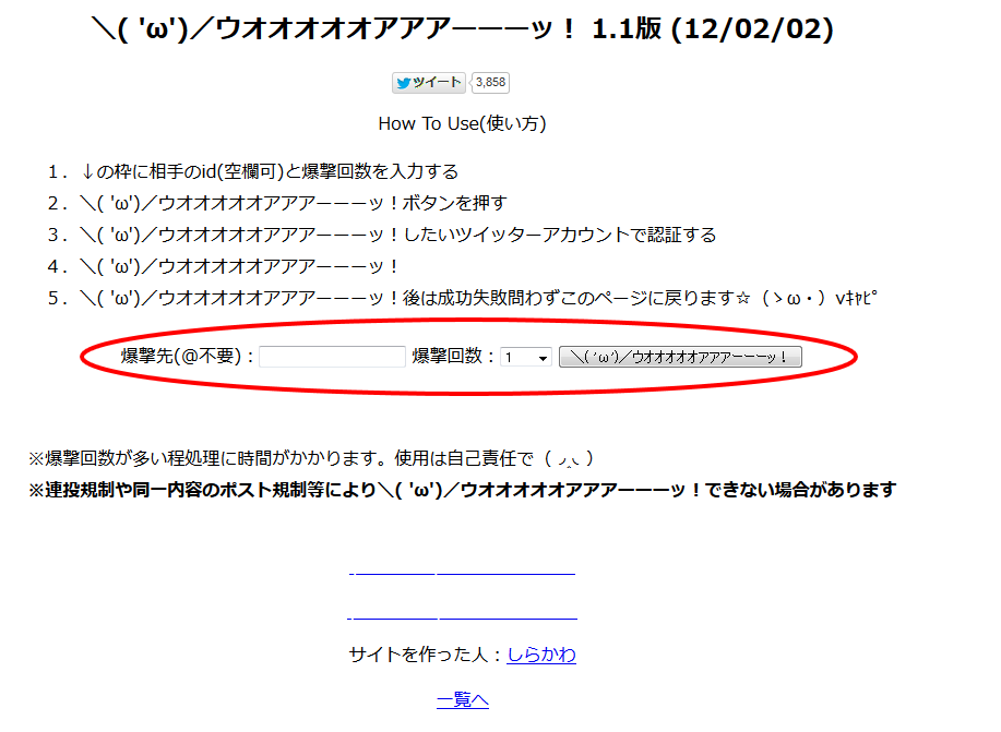 こちらもfav2youと同じく、IDと爆撃回数を入力するだけです。爆撃上限は127回みたい。
