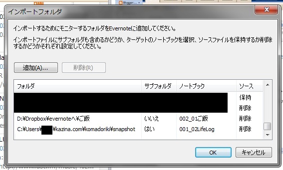 Cドライブのどこかに「snapshot」という名前のフォルダができているので、それをインポートフォルダにします。んで、サブフォルダを「はい」にして、任意のノートブックを指定します。