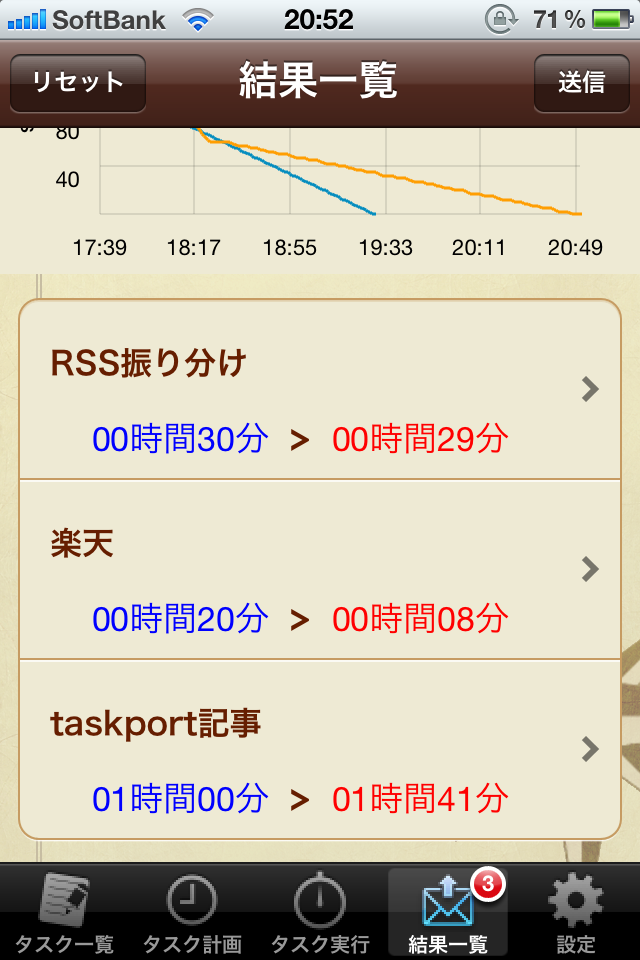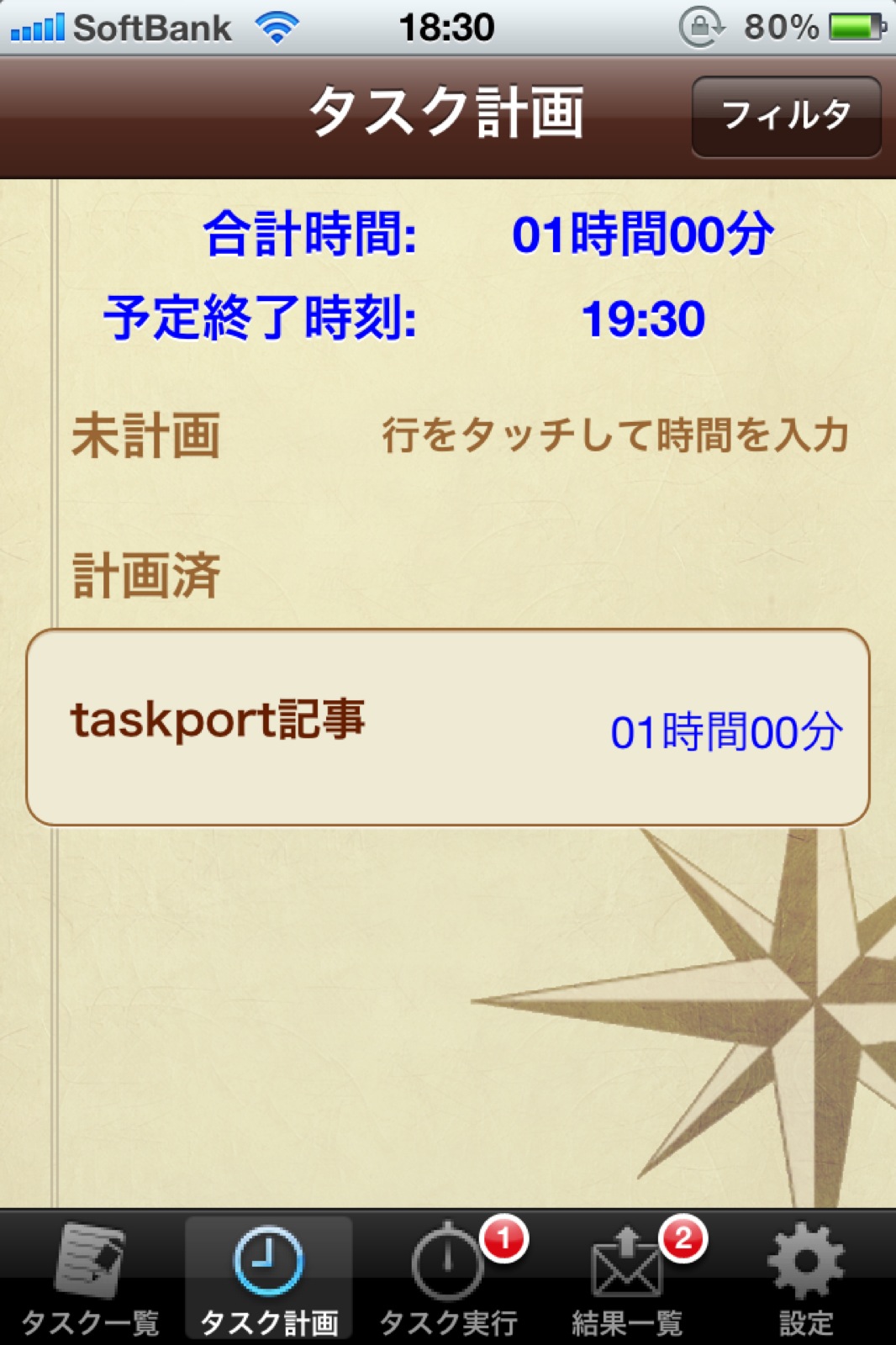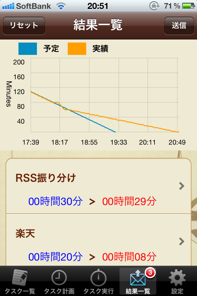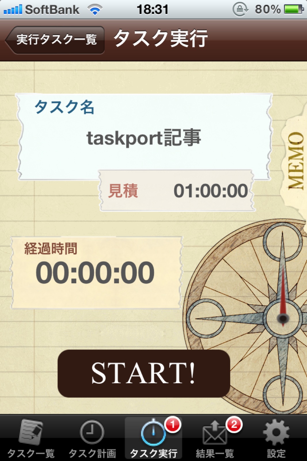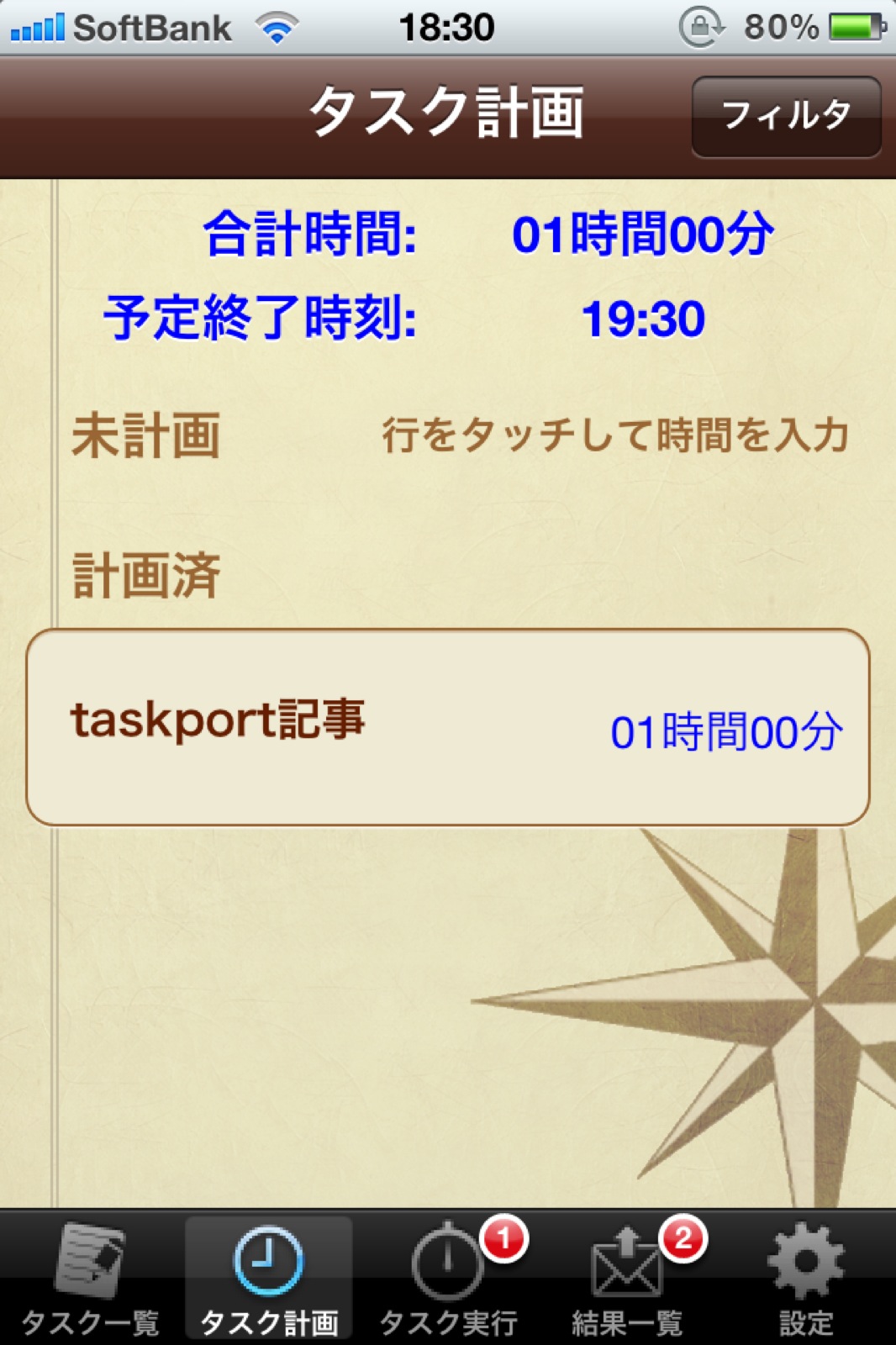 写真下部のタスク一覧からタスクを登録し、タスク計画でそのタスクに費やす時間を設定します。タスク実行から実際に実行し、完了したら結果一覧から結果を送信します。左から右に流れていくわけです。