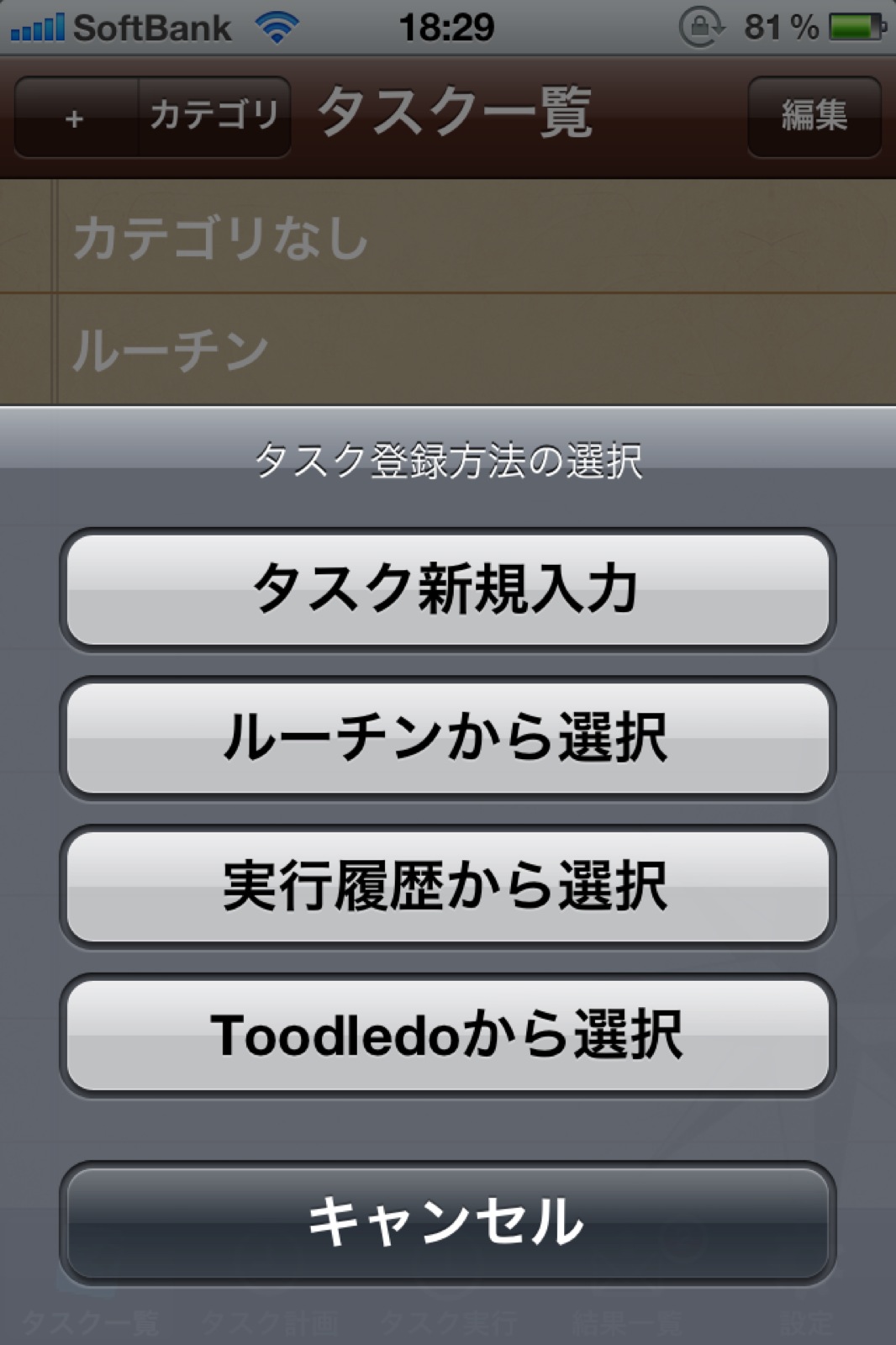 タスクの登録です。新規、ルーチン、履歴、Toodledoの4つから選択できます。