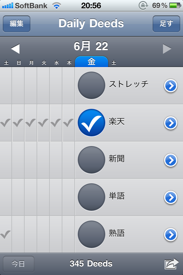 DailyDeedsを使ってやればそれを補うことができます。Toodledoではわからない「あの日ちゃんとやることやったっけ?」ってこととか、「最近しっかりできてねーなぁ」ってのが一目でわかる。