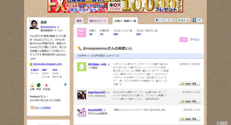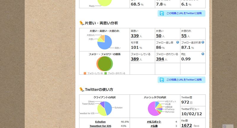 Twitterでの自分のつぶやきとかをわかりやすく解析してくれるサービスが面白いです。