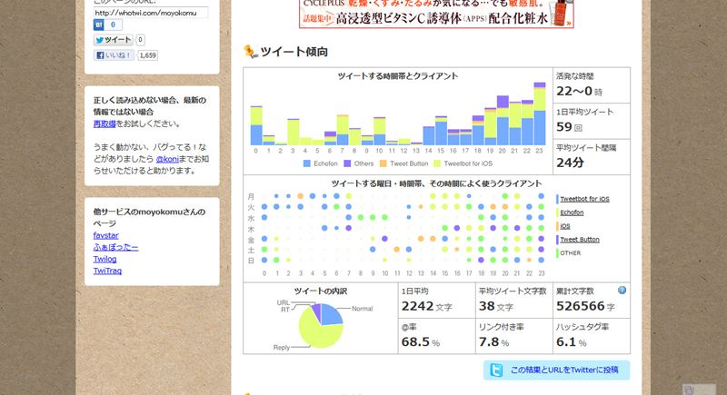 ツイート回数などの解析もしてもらえます。もう2年近くTwitterやってるんですね。