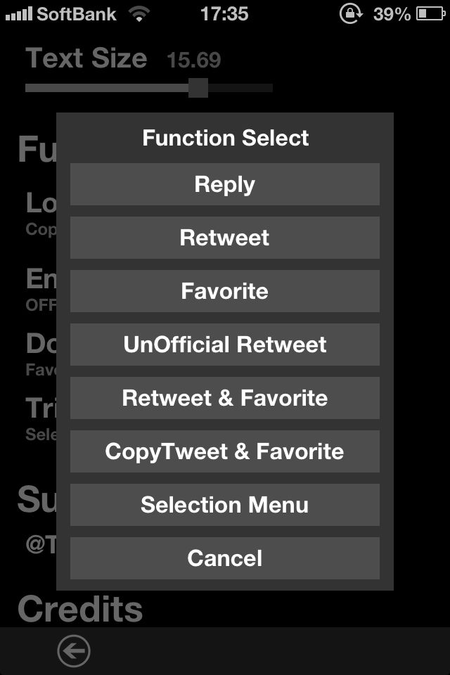 ツイートに対するアクションはこんな感じ。中でもCopyTweet&Favorite機能がいい。ちなみにこれをわかりやすく日本語訳するとパクってふぁぼる。